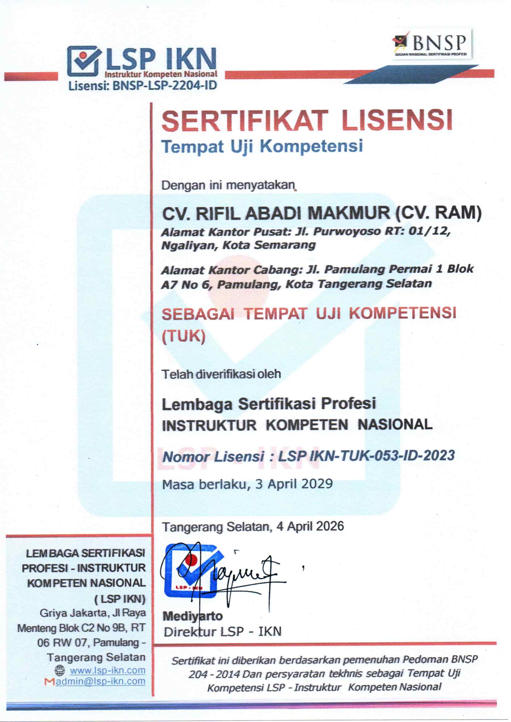 1. LSP IKN - BNSP Nomor Lisensi : LSP IKN-TUK-053-ID-2023; dan