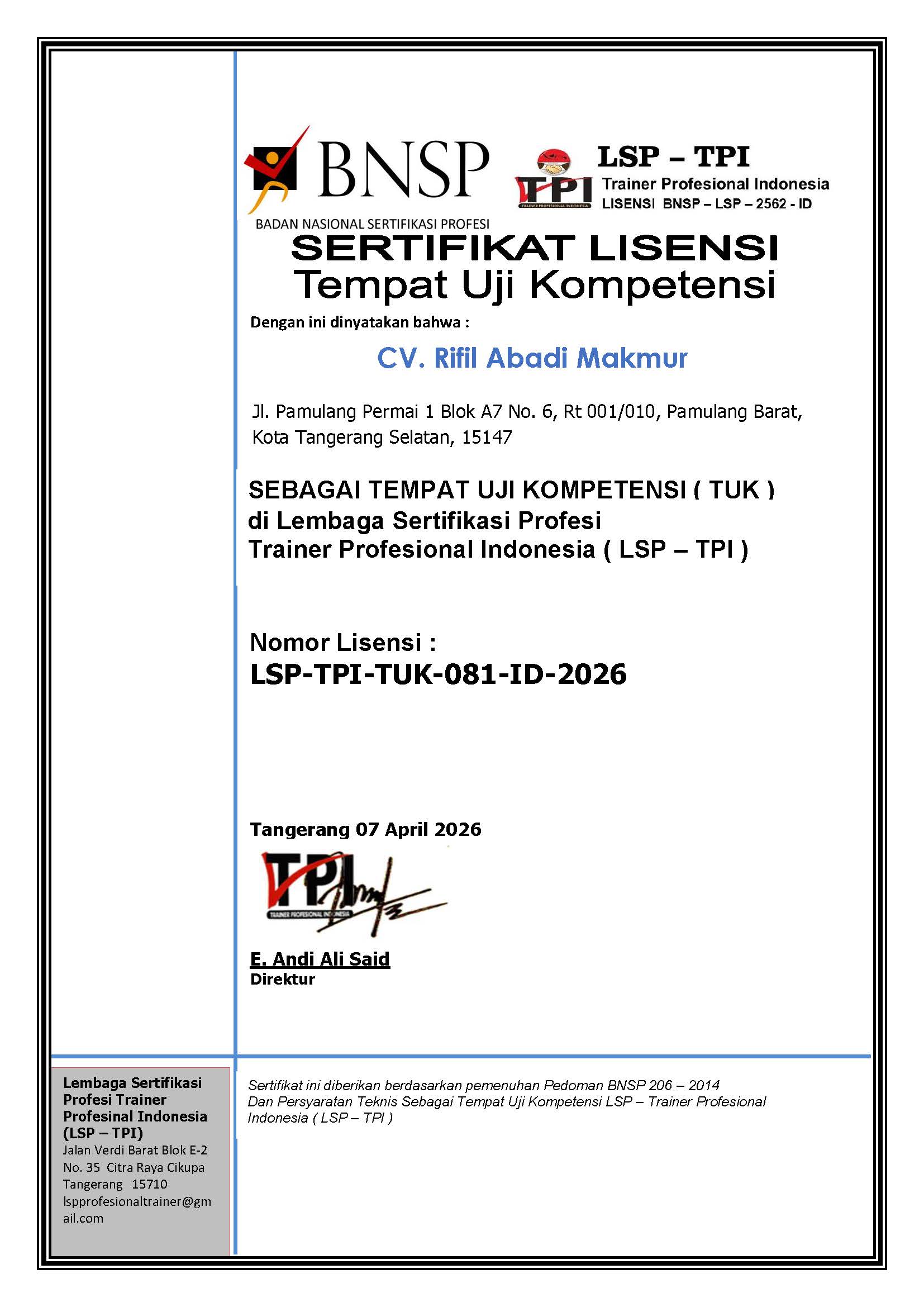 2. LSP TPI - BNSP Nomor Lisensi : LSP-TPI-TUK-081-ID-2026.